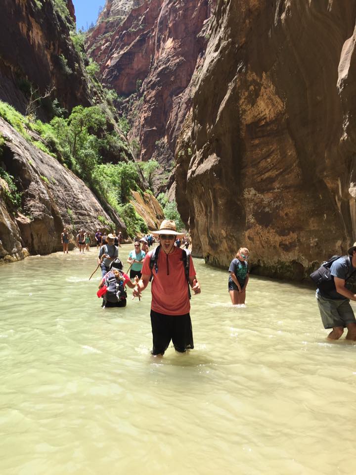 The Narrows (9.4 miles roundtrip) and Riverside Walk Trail (2.2 miles roundtrip): The Narrows is BY FAR one of the most exciting hikes we’ve done, and we have completed LOTS of trails throughout the 30 national parks we’ve visited to date. To get to The Narrows “trail,” you will take the Riverwalk Trail. This is an easy, paved, wheelchair accessible trail that follows along the Virgin River. To experience The Narrows, you will have to get into the Virgin River. Appropriate attire is a MUST! We were definitely not prepared for this hike and wore gym shoes…NOT recommended! Wear waterproof, hard-soled shoes with good grip and invest in trekking poles for stability and balance, along with proper attire! The water level can change at any time as you are wading through the water trail, and the rocks are slippery. Trekking poles allow you to foresee the depth as you move forward. In some places, the water was chest deep. You can rent shoes and poles for this hike at the national park as well. I also recommend getting some sort of waterproof bag for your items, especially phones and cameras.