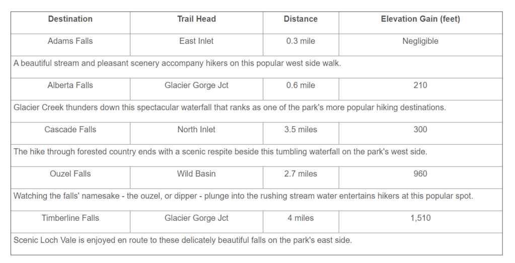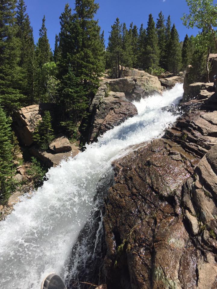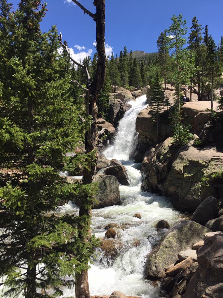 Alberta Falls (1.6 miles out and back): After the short, easy stroll around Bear Lake, we began our next hike to Alberta Falls, which begins at Glacier Gorge Junction trailhead at Bear Lake. This hike is short and easy, and is one of the most popular hikes in the park. Get there early!