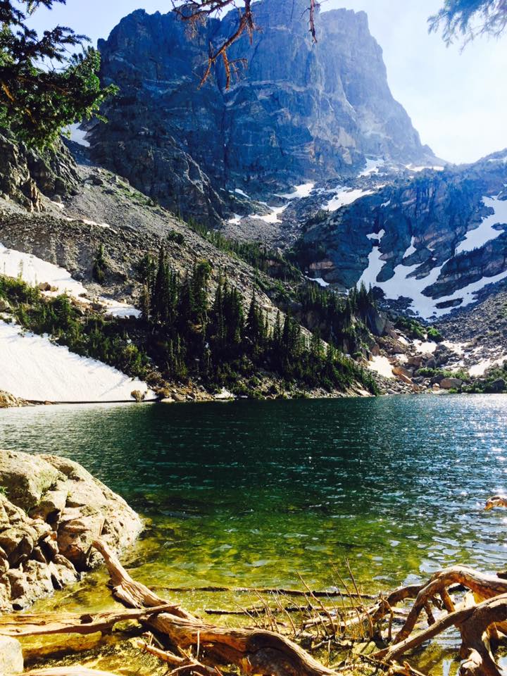 Emerald Lake (3.5 miles out and back, about 700 feet elevation gain): After returning from Alberta Falls, we took our next adventure to Emerald Lake. This trail begins from the Bear Lake Trailhead and is a very popular hike. Along this trail, you will pass 2 alpine lakes: Nymph Lake (at 1.2 miles roundtrip) and Dream Lake (at 2 miles roundtrip). At the end of the trail, you will approach the absolutely beautiful Emerald Lake (at 3.5 miles roundtrip). In the distance, you can see the rocky peaks of Flattop Mountain at 12,324 feet and Hallett Peak at 12,713 feet. Once we arrived here, we had lunch on the rock ledges and enjoyed the view. Although there were many people here, it was still so quiet and peaceful.