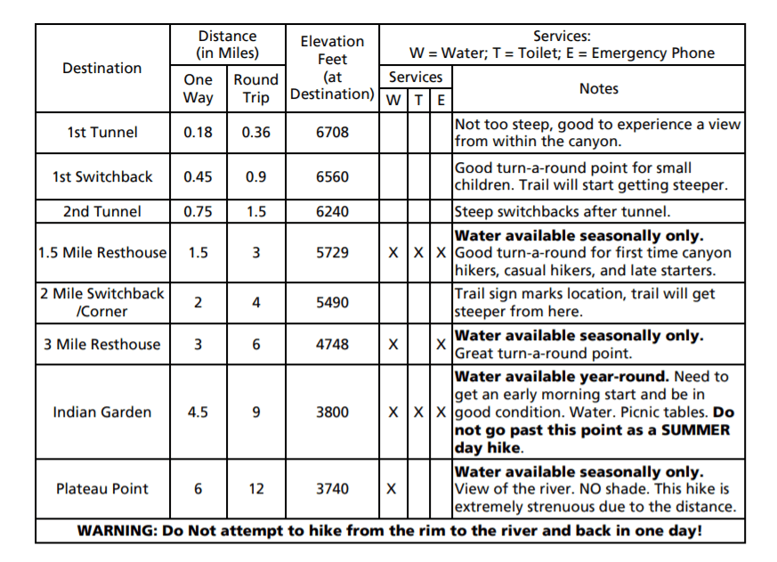 Bright Angel Trailhead (16 miles roundtrip): Grab a quick, but hearty breakfast (granola, oatmeal, ect..), lots of water, and head out EARLY to the trail, especially during the peak summer months when this trail becomes especially crowded and hot. This trail is located just west of Bright Angel Lodge. It is a steep hike into the canyon, but is well-marked and maintained. It is one of the most popular hikes in the park, with breath-taking views of the canyon. This hike continues to be one of my favorites out of all the national park hikes we’ve done. I felt this trail captured so much beauty of the canyon at every turn. It can become so easy to get lost in the scenery and sheer magnitude of the canyon. Please pay attention as to how far down you are hiking. This was one of the best pieces of advice from a park ranger as we began our descent. You can lose track of this because the hike seems so “easy” going down and hikers forget they have to hike back UP! Yikes! Allow yourself twice as much time to hike up as you hiked down. On this day, we hiked about 3 miles down (and then 3 miles back up). See the chart below from the park service in regards to turn around points along the trail. The trail is not recommended to be done in one day. If you are visiting in the winter or early spring, the trail may be dangerously icy. Learn more about this trail through the NPS: Bright Angel Trail