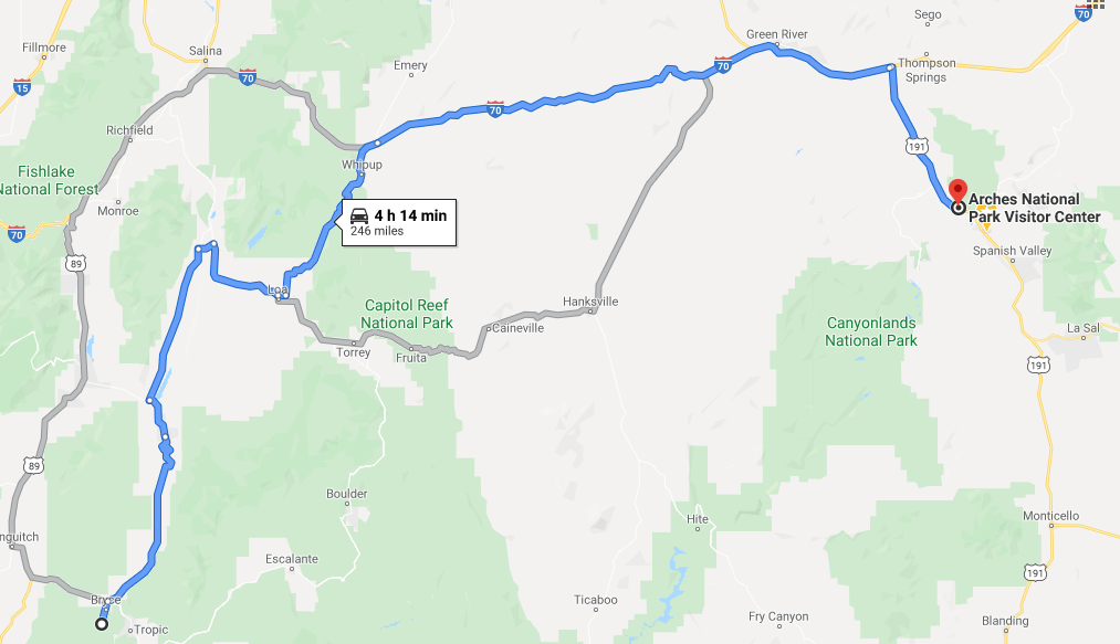 We said goodbye to Bryce Canyon and made the little over 4 hour drive to Arches NP via 70E. Looking at the map below, you could easily add a day or two and explore Capitol Reef NP because it’s not too far out of the way (about 30 miles). Because we only had a week to get back to Chicago, we did not stop here. I have heard so many great things about this park, especially for those who love hiking! It is one of the Mighty 5 Utah parks. If you’d like to explore Capitol Reef, the national park service website has some great information: Capitol Reef. There is also a cute little town within it called Fruita. Check it out if you have the time!